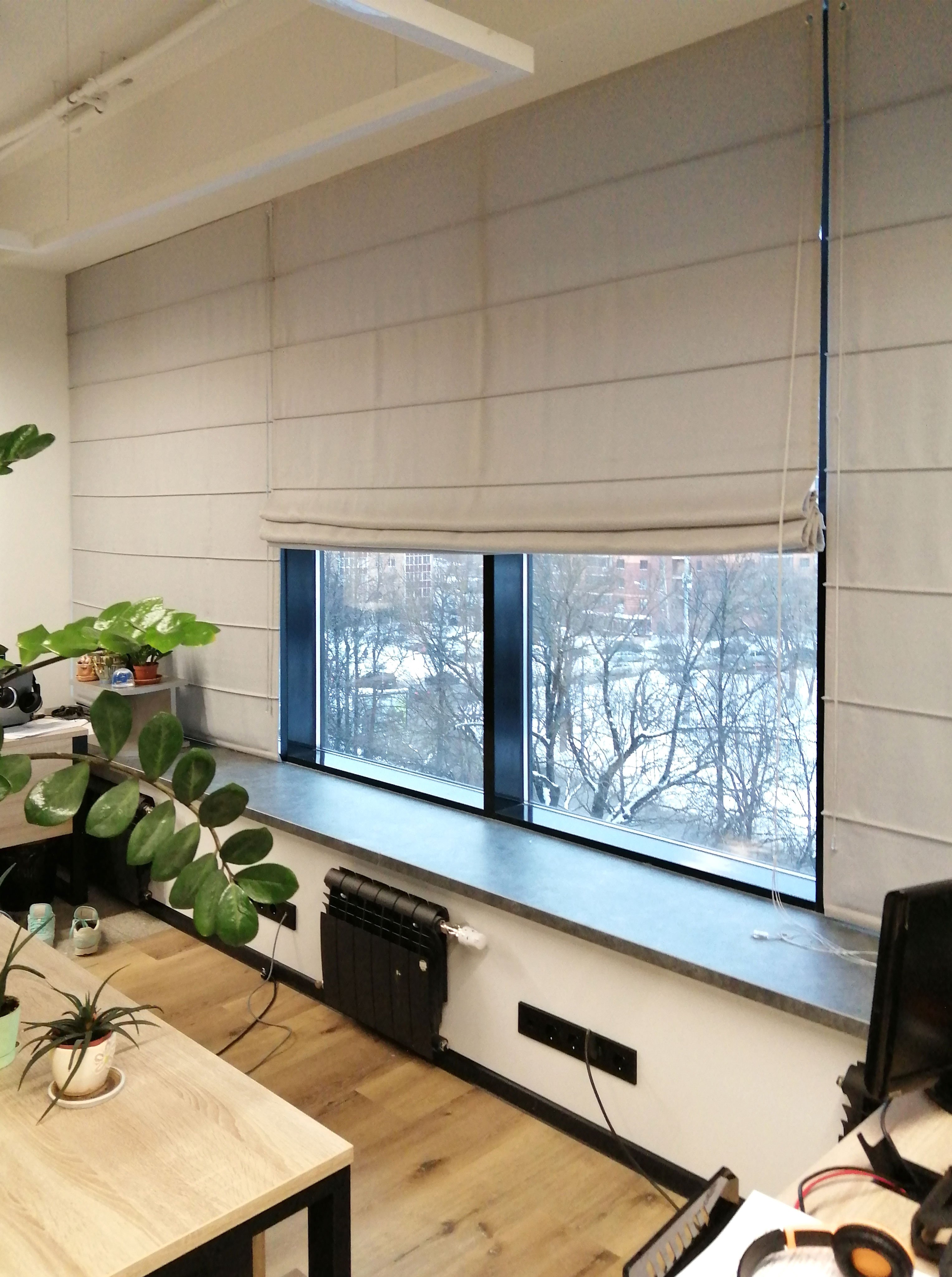 Мы предлагаем римские шторы на аккумуляторе (удобно, если к окну не подведен кабель) и модели, которые могут работать как от сети 220В.